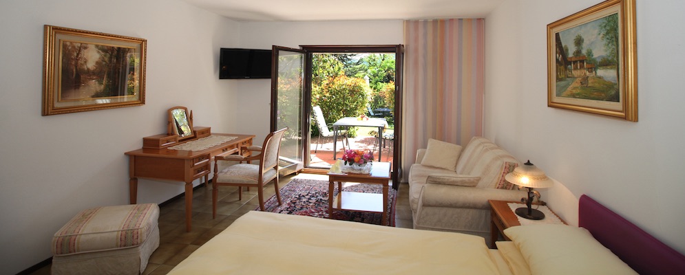 Unsere Zimmer liegen im Grünen und ermöglichen Ihnen die Ruhe in vollen Zügen zu geniessen. Die Zimmer befinden sich an einer sonnigen Süd Lage mit sehr schöner Aussicht, mit eigenem Garten, Stühle und Tisch. Mit eigenem Eingang. Wohnzimmerecke mit Sofa, Schreibtisch, Badzimmer mit Dusche-WC, Föhn, Radio, TV LCD, kostenloses Internet Wifi, Telefon, Safe, Minibar, Nespresso Kaffeemaschine. |